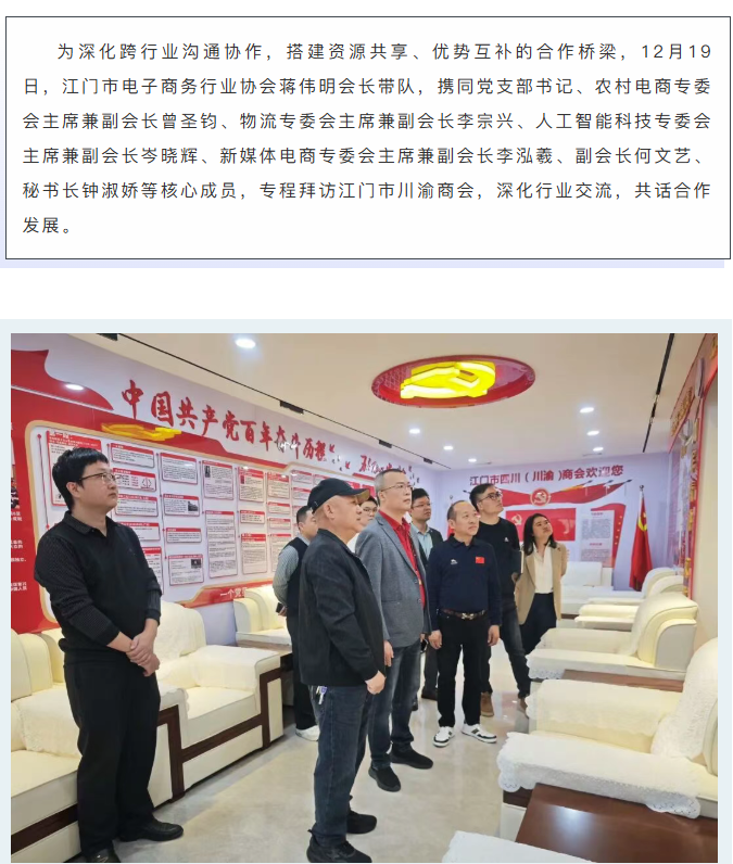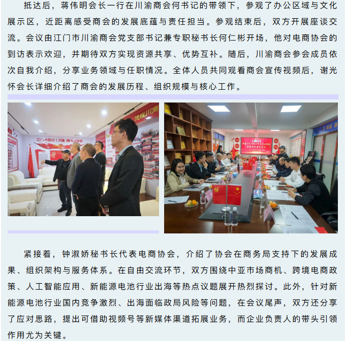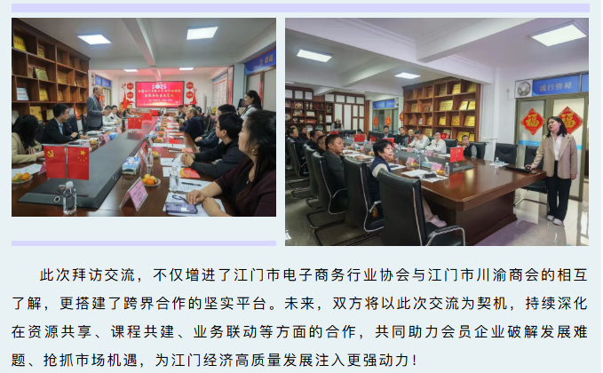 【协会动态】跨界联动,共探新机——拜访江门市川渝商会 发布时间:2025-12-30 分享至: 上一条:【协会动态】走访企业取真经,交流互鉴促发展——江门市电子商务行业协会开展企业走访活动 下一条:【粤车南下,邑商出海】——启动仪式圆满举行