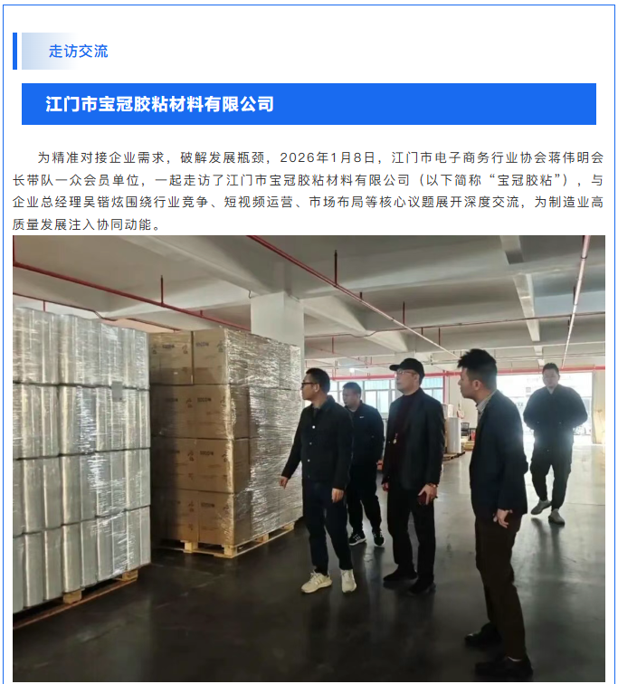 【协会动态】共探制造企业破局之道——走访江门市宝冠胶粘材料有限公司 发布时间:2026-03-04 分享至: 上一条:【活动邀约】家居用品不锈钢行业增长新路径: AI让你不再等订单 下一条:【协会动态】广东工业大学江门校友分会到访我会交流座谈